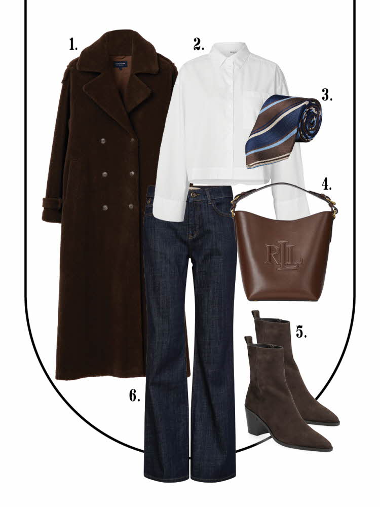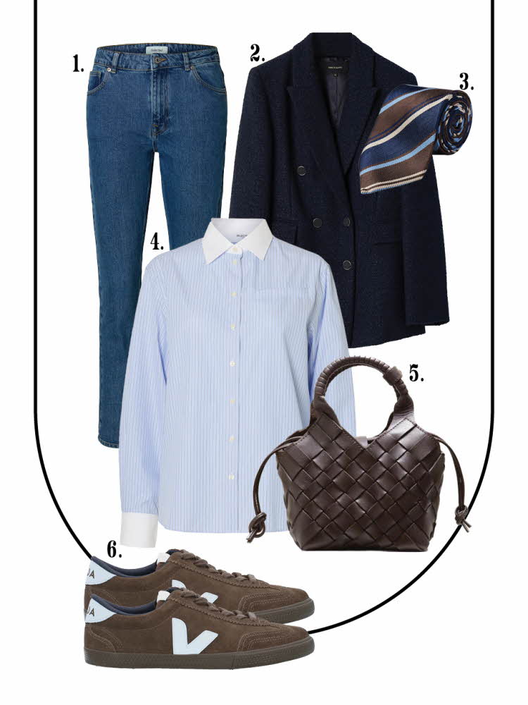 1. Kåpe 5995,- Lexington // 2. Skjorte 599,95 Selected // 3. Slips, These Glory Days 499,- Volt // 4. Veske, Ralph Lauren 5199,- Stil // 5. Støvletter, Billi Bi 2999,- Shoe Gallery // 6. Jeans, Mos Mosh 1799,- Boutique No6