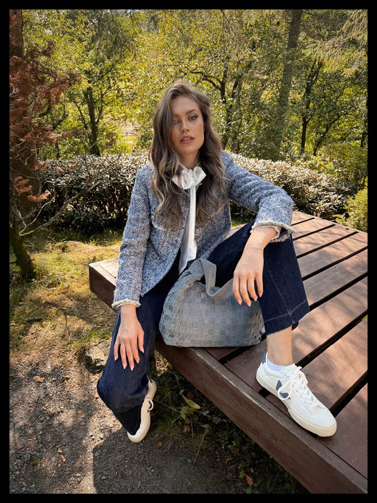 Jakke, White Label 3299,- / Bluse, Ane Mone 2499,- / Jeans, Mac 1499,- Alt fra Emil // Veske, Nunoo 2999,- Boutique No6 // Sneakers, Veja 1799,- Shoe Gallery