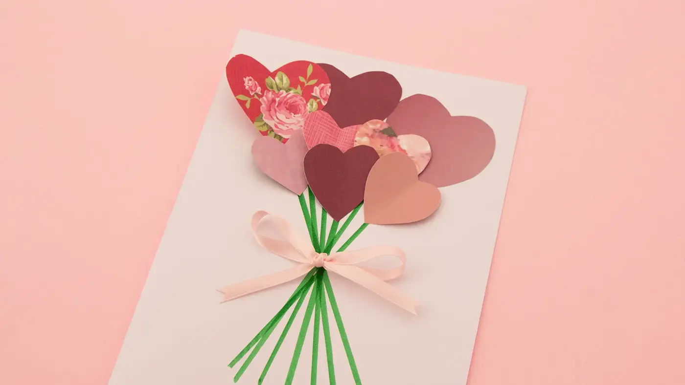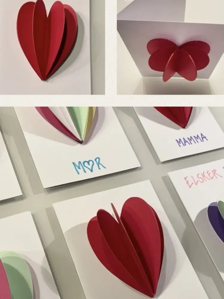 Bonustips: Brett hjertene forsiktig i to og fest kun lim på midten eller på en av sidene. På denne måten kommer «blomstene» bedre frem og kortet får et mer livlig utseende. Det får rett og slett en liten 3D-effekt.