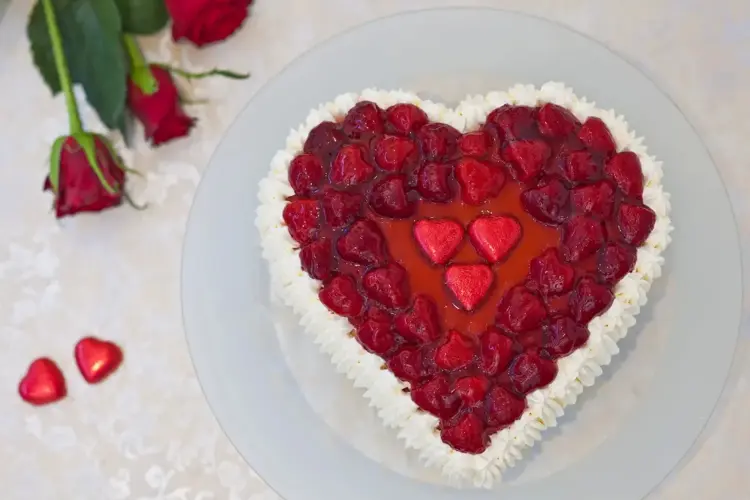- Plasser to eller tre sjokoladehjerter på midten av kaken og fyll inn resten av hulrommet med bringebær.