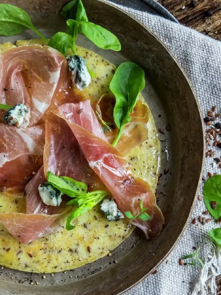 - Server gjerne pannekakene med spekeskinke, biter av blåmuggost og frisk spinat. Drypp over litt god olivenolje og krydre med litt grovkvernet pepper.
