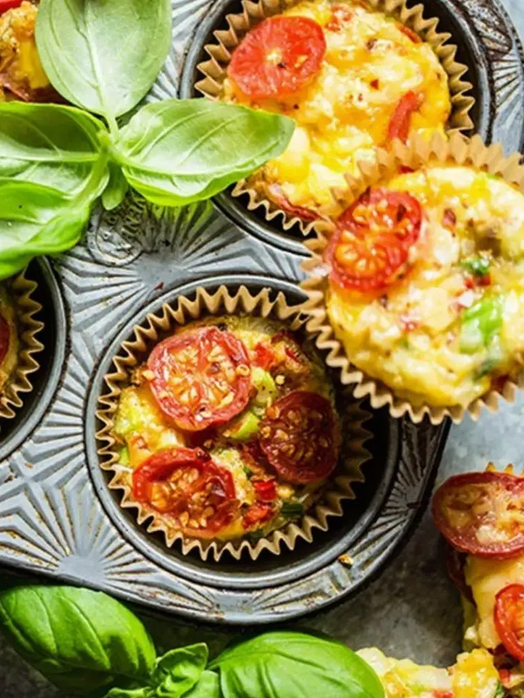 - Fyll muffinsformene og stikk en cherrytomat ned i midten av hver muffin.