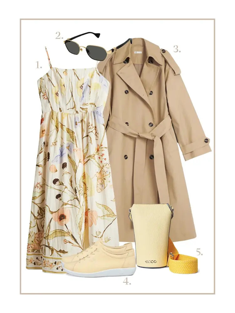 1. Kjole 329,- Hennes & Mauritz // 2. Solbriller, Gucci Optiker Svabø // 3. Trenchcoat 1299,- Cubus // 4. Sneakers 1500,- Ecco Store // 5. Veske 1700,- Ecco Store