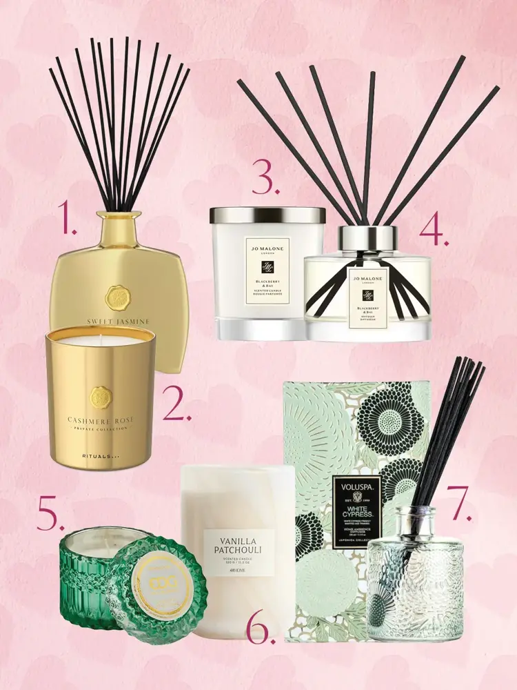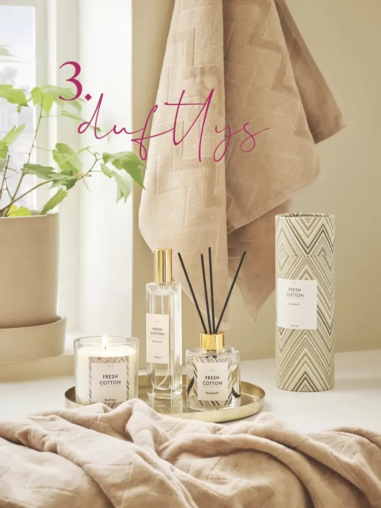 1. Duftpinner, Sweet Jasmine 450ml 639,- Rituals // 2. Duftlys, Cashmere Rose 449,- Rituals // 3. Duftlys, Jo Malone London 795,- Fredrik & Louisa // 4. Duftpinner, Jo Malone London 165ml 1125,- Fredrik & Louisa // 5. Duftlys, EDG 430,- Stil // 6. Duftlys 179,- H&M Home // Duftpinner, Voluspa White Cypress Reed Diffuser 100ml 600,- Infinity