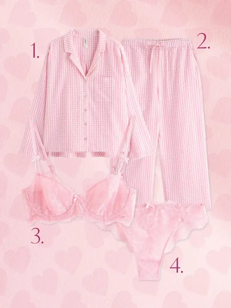 Alt fra Lindex: 1. Pyjamas overdel 399,- // 2. Pyjamas underdel 399,- // 3. Bh 299,- // 4. Truse 129,-