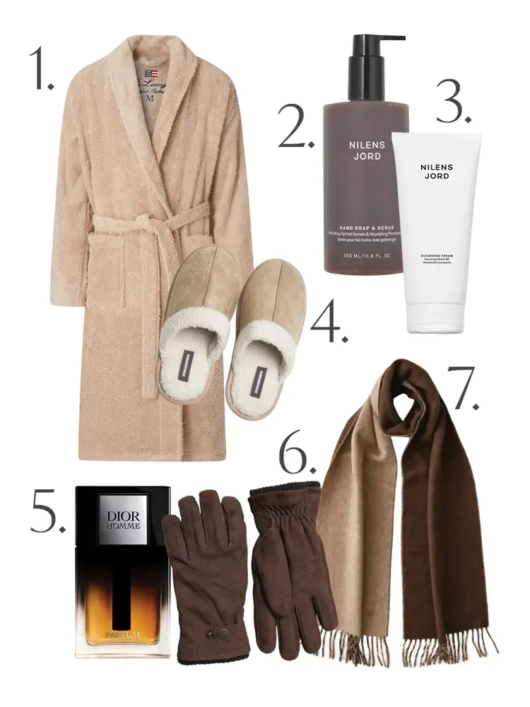 1. Morgenkåpe 1895,- Lexington // 2. Håndsåpe, Nilens Jord 350ml 399,- Kicks // 3. Renseskum, Nilens Jord 200ml 259,- Kicks // 4. Tøfler 249,- Dressmann // 5. Duft, Dior Homme Parfum 50ml 1410,- Fredrik & Louisa // 6. Hansker, Hestra 1099,- Volt // 7. Skjerf, Morris 1199,- Hans H.