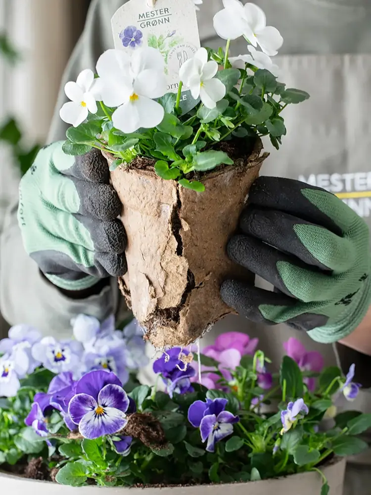 Hos Mester Grønn finner du viola som både er spiselig og bievennlig, og som kommer i plantebaserte og plastfrie potter som kan plantes rett i jorden.