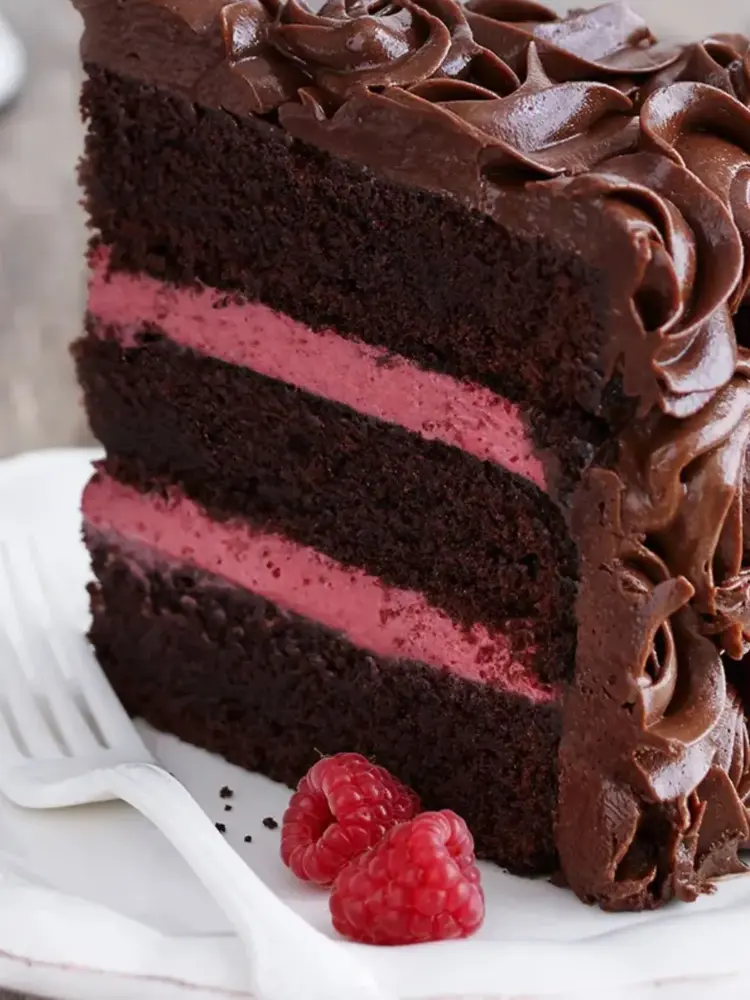 Dette er den ultimate sjokoladekaken som virkelig imponerer! En saftig festkake med masse deilig sjokolade og frisk bringebærmousse.